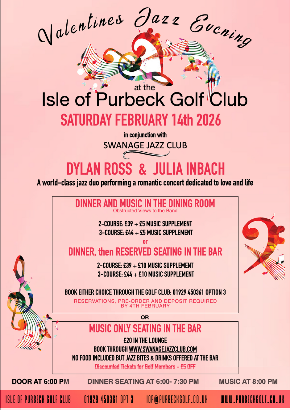 The Isle of Purbeck Golf Club in partnership with the Swanage Jazz Club, Valentine’s Weekend sees Dylan Ross return to his home town joined by a rising star of London’s West-End, Julia Imbach. Fronting a world-class jazz Quartet, they will perform a romantic concert dedicated to two legendary artists in duo, Frank Sinatra and Liza Minnelli. Expect to hear interpretations of iconic jazz standards and some classic love songs in a classy and intimate setting looking over the idyllic Isle of Purbeck.